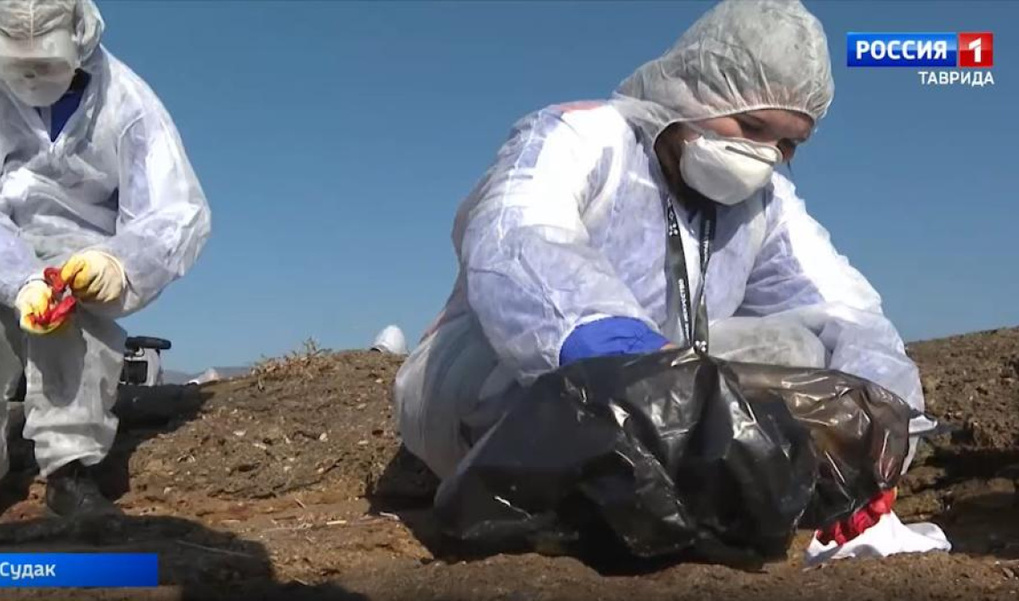 Студенты-волонтёры со всей страны помогают убирать мазут с побережья Крыма.
