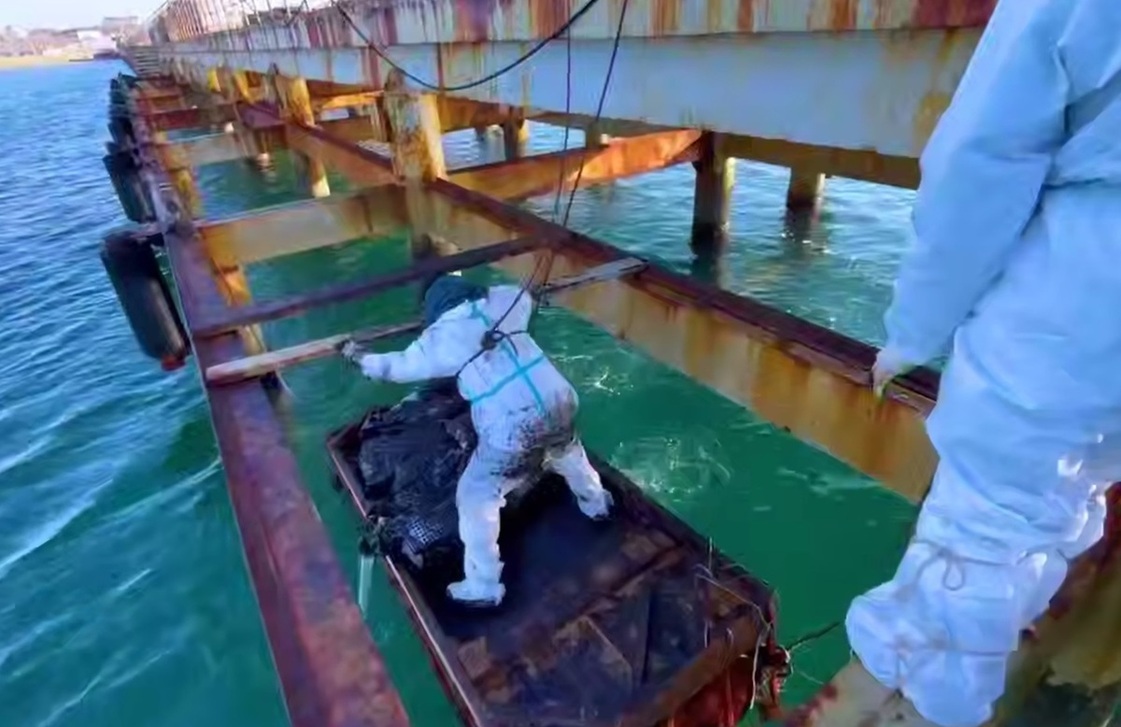 Специалисты МЧС очистили дно около причала в Витязево, подняв 100 мешков с мазутом.